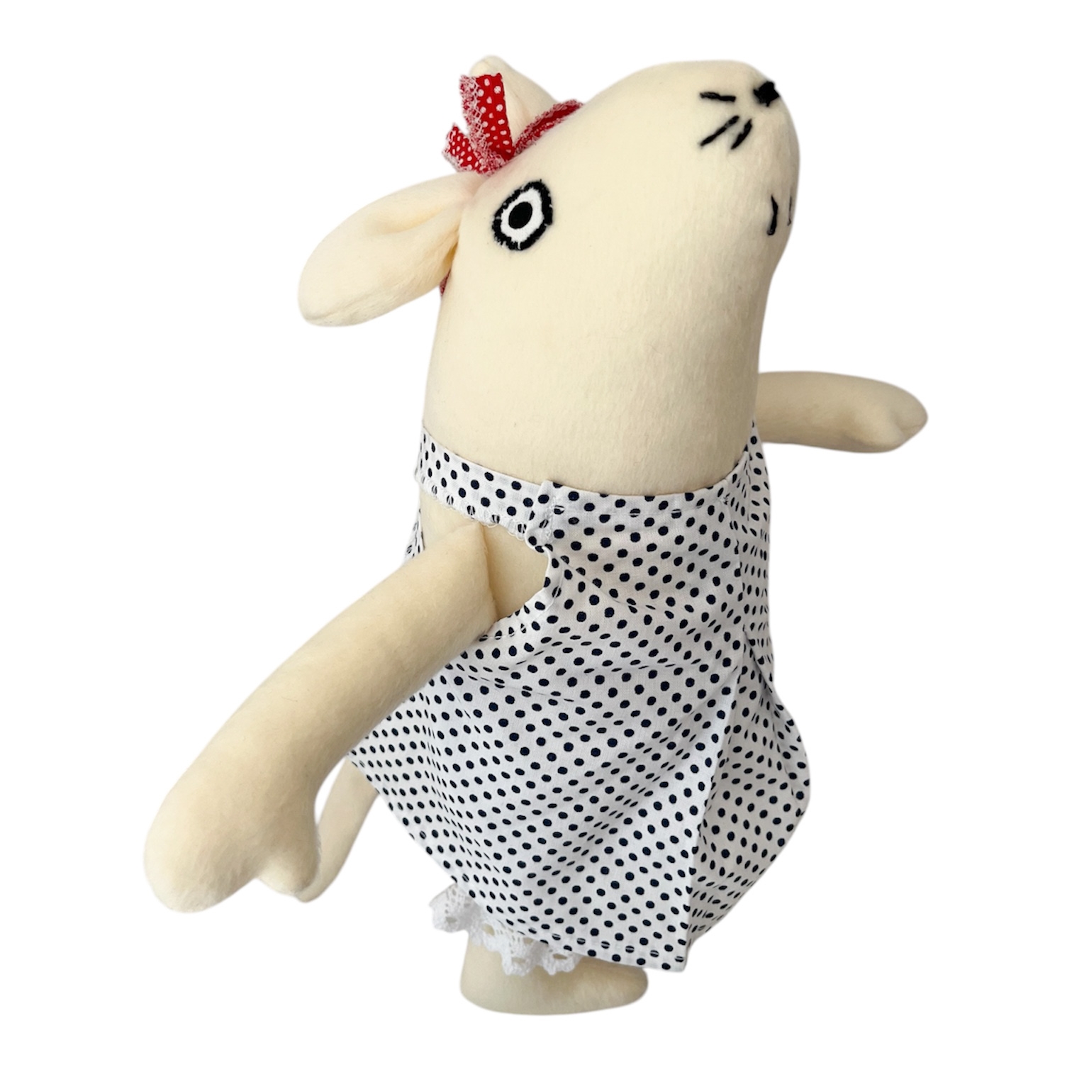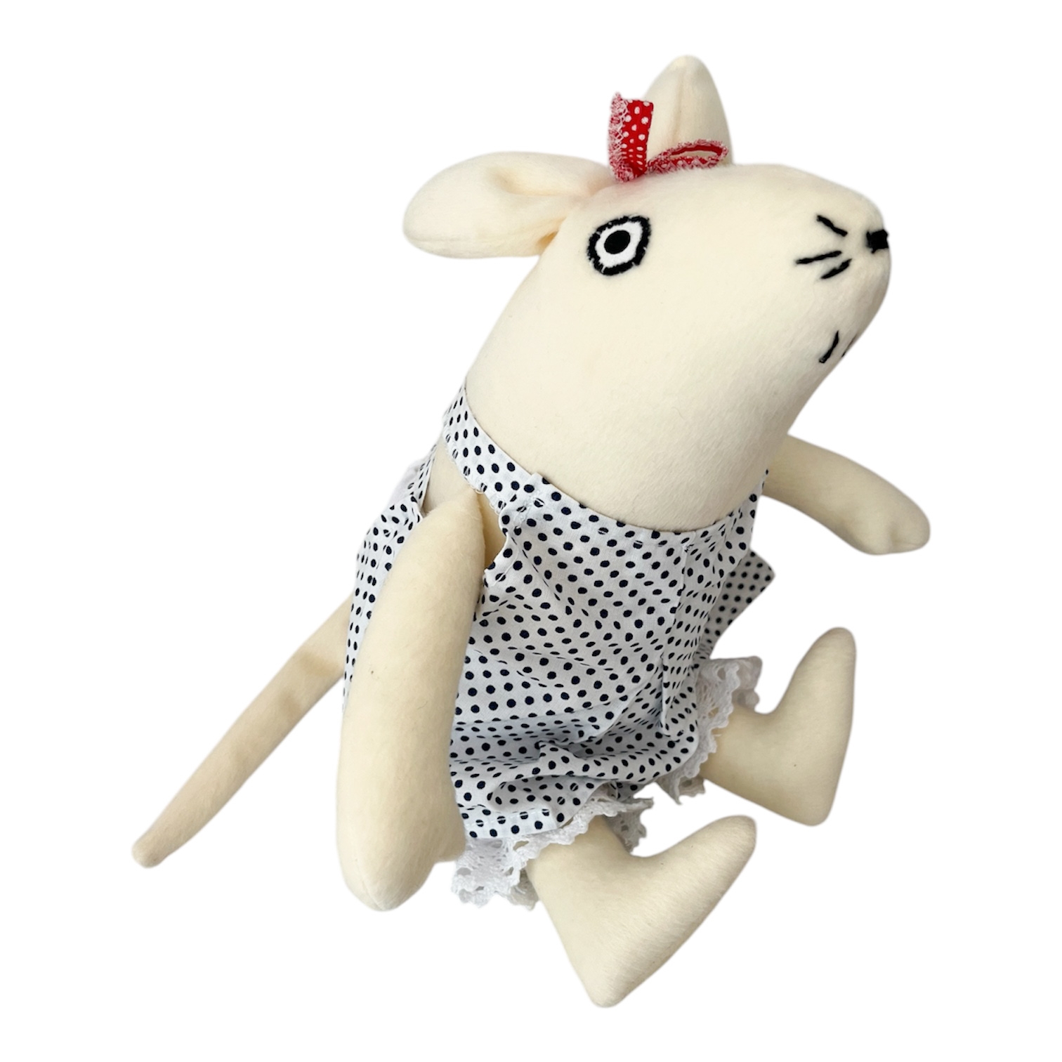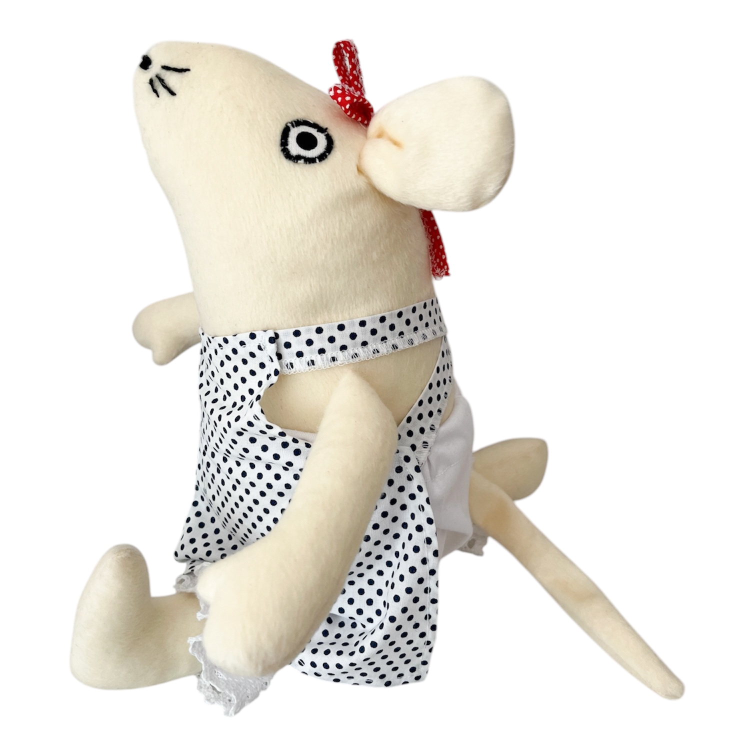 Przytulanka Mysz w sukience w granatowe kropki. Idealna zabawka na całe dzieciństwo.